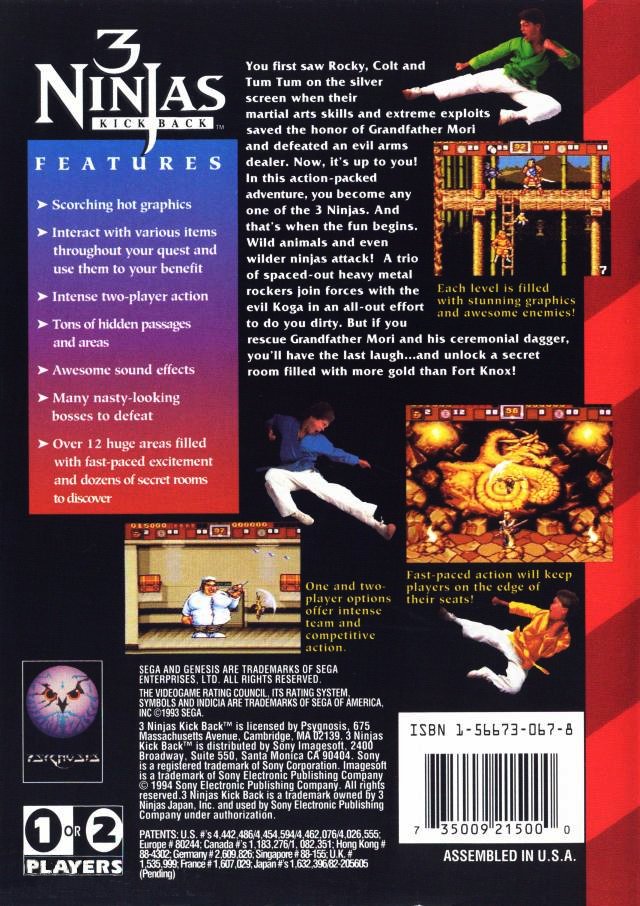 This is a traditional platform game based on the movie 3 Ninjas Kick Back. Each one of the three ninjas has unique weapons and abilities. All three of them can run, duck, crawl, climb, jump, and hang on trees, ropes, etc. You'll encounter many obstacles and enemies, both regular and boss-like, which you'll have to overcome and defeat.