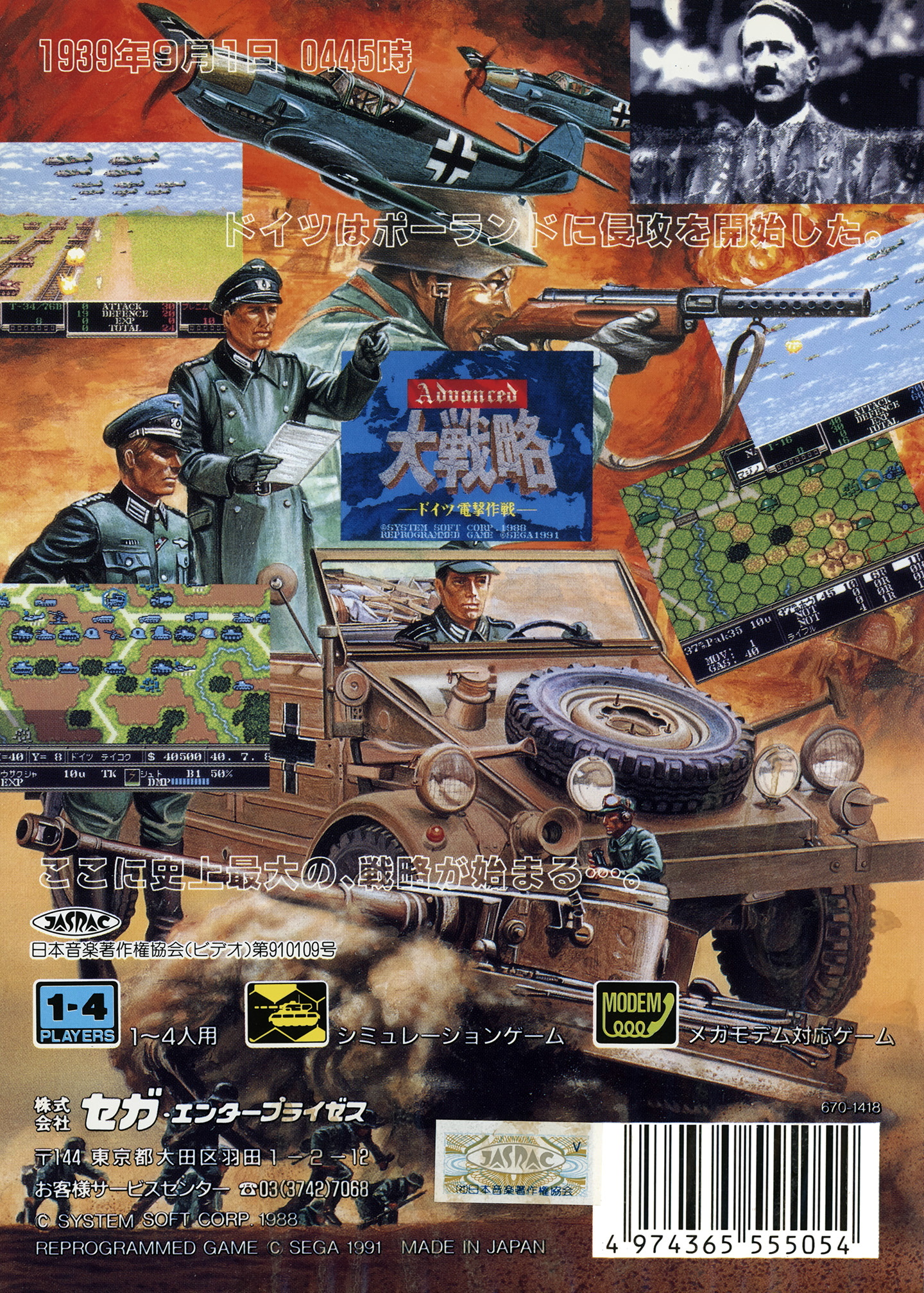 Advanced Daisenryaku is one of the many titles in SystemSoft's long-running war strategy simulation series. This version is one of the first to feature a full campaign mode, and takes place during World War II with the player commanding the German Nazi army, starting with the invasion of Poland in 1939. Depending upon the outcome of each battle, different paths might be taken that can diverge wildly from historical fact.