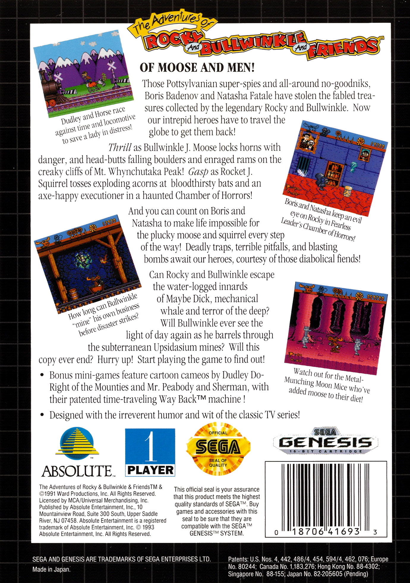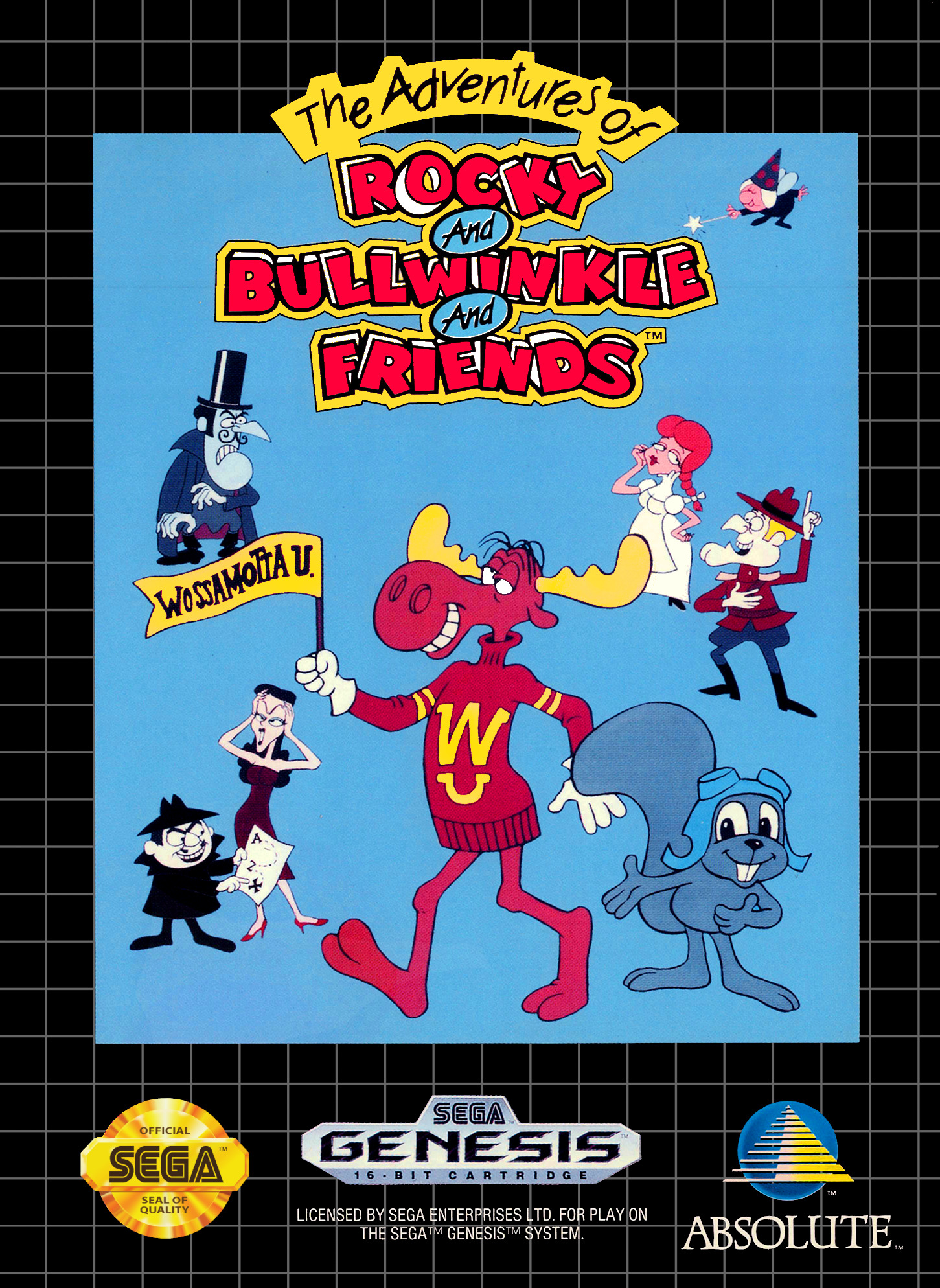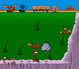 The Adventures of Rocky and Bullwinkle is the video game adaptation of the 60's cartoon series staring Bullwinkle, a moose, and Rocky, a flying squirrel. The game plays out much like an episode of the show. The story begins at the dedication of the Frostbite Falls Rocky and Bullwinkle museum. Unfortunately, the not-so-nice Boris and Natasha have disguised themselves as security guards for the museum and managed to steal some of the priceless artifacts. Bullwinkle and Rocky must track down the stolen artifacts and return order to Frostbite Falls. Most of the action is of the side-scrolling platformer variety, but along the way, you will get to play lots of mini-games involving characters from the show. During the platforming sections you can switch instantly between the two protagonists. Both play differently: Bullwinkle can throw bombs at enemies and Rocky can fly for short instances.
