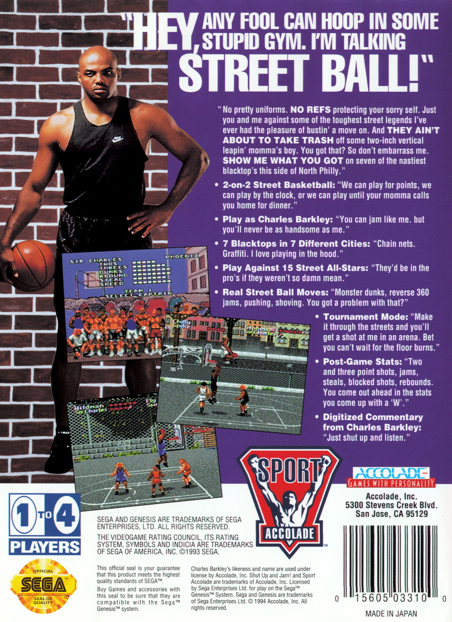 This game is a sequel to Barkley: Shut Up and Jam!. It is a street basketball game which means no referees to enforce fouls and no shot clock to force a player to take a shot. The game features an exhibition and a tournament mode.