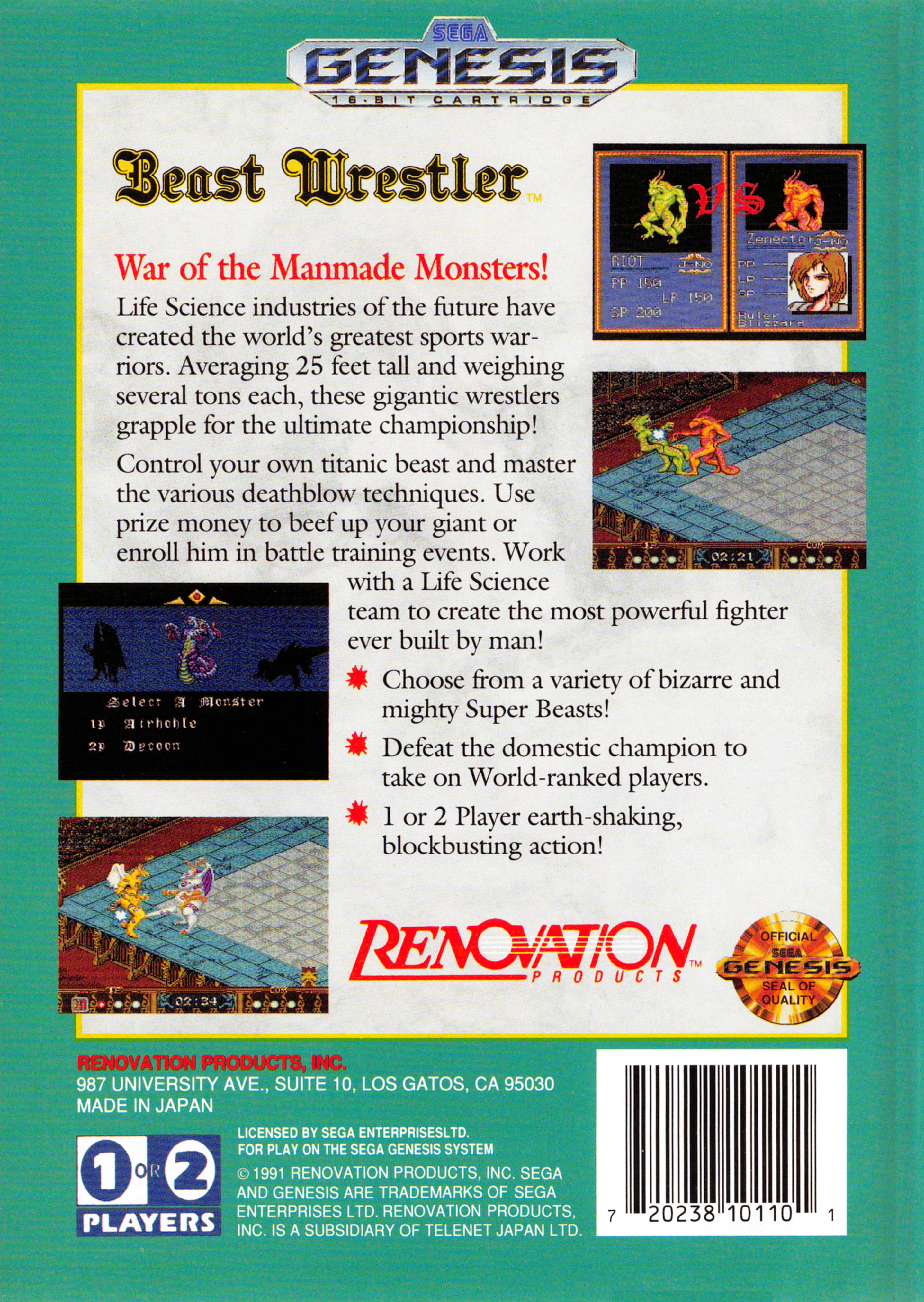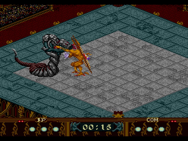 A one on one fighting game seen from an isometric perspective. All beasts or dragons have two basic attacks: a punch and a tail attack, as well as a special attack that can only be performed while a certain icon is displayed. During close combat, pressing the A or C button rapidly will result in a throwing or choking attack. There is no visible health bar, but three icons are displayed at the bottom of the screen. Once a dragon is knocked down for a longer moment, one icon turns red. Once all icons are red, the fight is lost. The battle arena is surrounded by an electric fence, that opponents can be thrown into and which can also be used to initiate jump attacks.