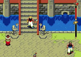 Beyond Oasis (also known as The Story of Thor) is a fast-paced action game with RPG elements. The Prince's default weapon is the knife, which has unlimited uses. During the course of the game, the hero will also find other weapons, such as bows, swords, and bombs. All these weapons have limited uses and will eventually break.