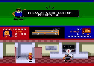 As either Mobo or Robo, you must collect all the treasures before leaving the ten buildings and shoot any security guards that get in your way. Remember that you are under a time limit. An in-game map will help you locate the treasures. There is a bonus stage after three buildings, where the object is to collect the gold bars in a limited amount of time without one of the three spotlights shining on you. If it is possible, hide behind open doors. If you manage to get all the gold bars, 10,000 points is added to your score. There are three of these bonus stages, but each of them varies.