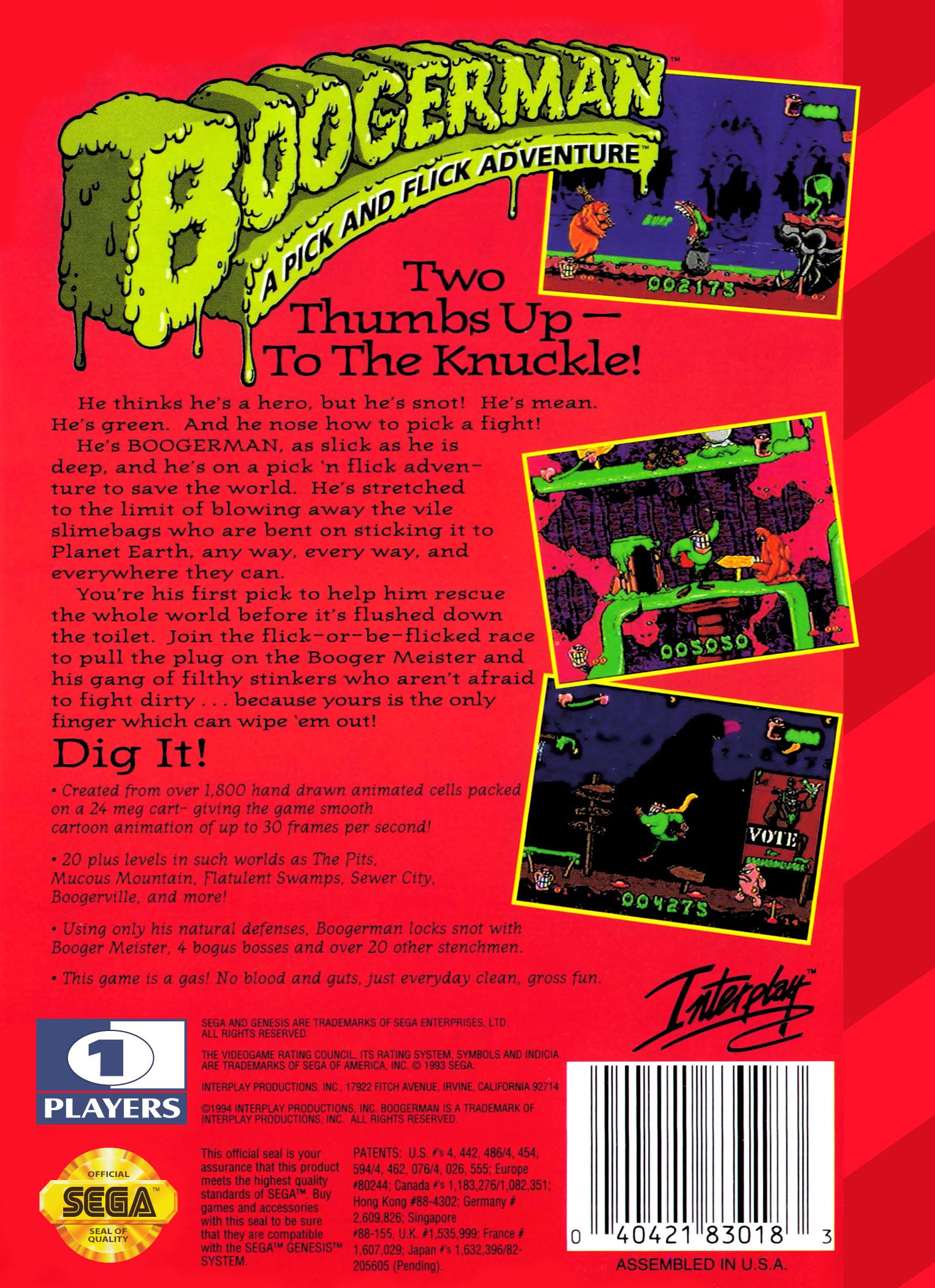 Boogerman is a jump-and-run game where the protagonist flicks boogers and farts at enemies in order to stand a chance against the evil Boogermeister. The game features about 20 levels of dirt, slime and bad taste in worlds like "Mucous Mountains", "The Pits" and "Flatulent Swamps".