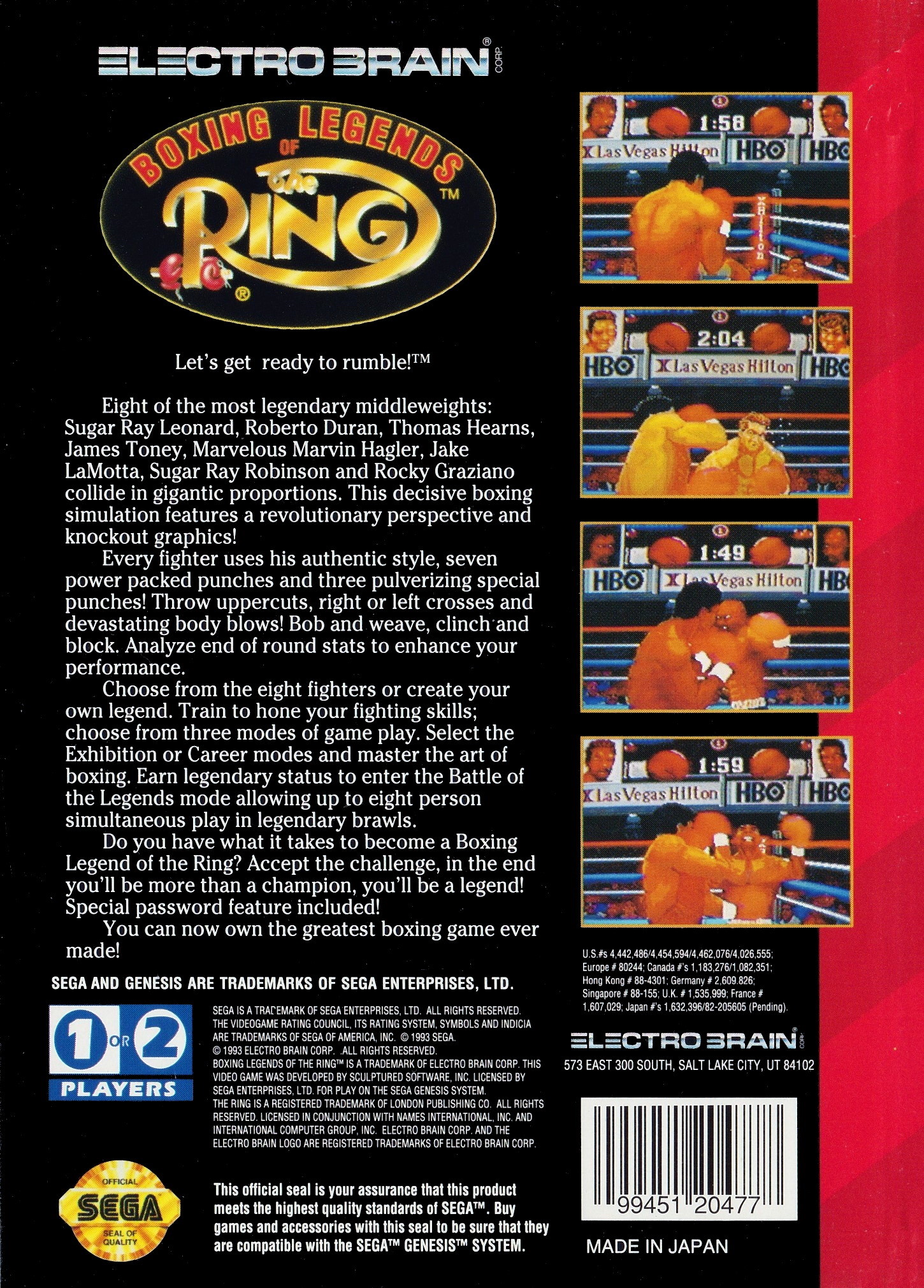 Boxing Legends of the Ring lets you take control of eight middleweight legends of boxing, Roberto Duran, Tommy "Hitman" Duran, Jake "Raging Bull" La Motta, Rocky Graziano, "Sugar" Ray Robinson, "Sugar" Ray Leonard, "Marveleous" Marvin Hagler and James Toney. You can either compete in an exhibition mode or play in career mode and become the greatest of all time.