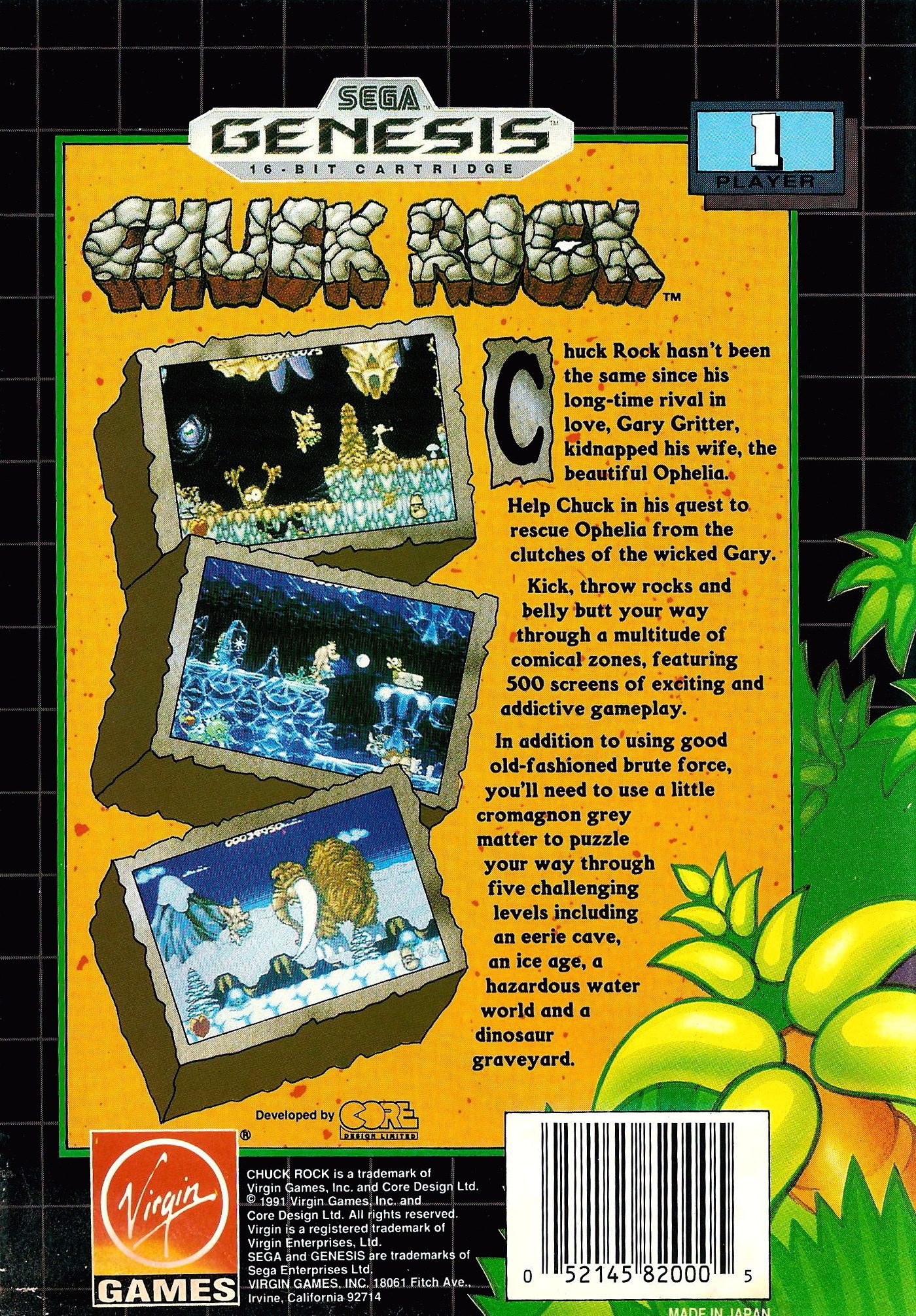 Chuck Rock is your typical average cave man. He likes to spend his Sunday afternoons watching football and drinking beer. Unfortunately, his peaceful existence is interrupted one day when his wife, Ophelia Rock, is kidnapped by the village wierdo, Gary Gritter. So, Chuck is rather upset about this whole situation and you have to help him make things right.