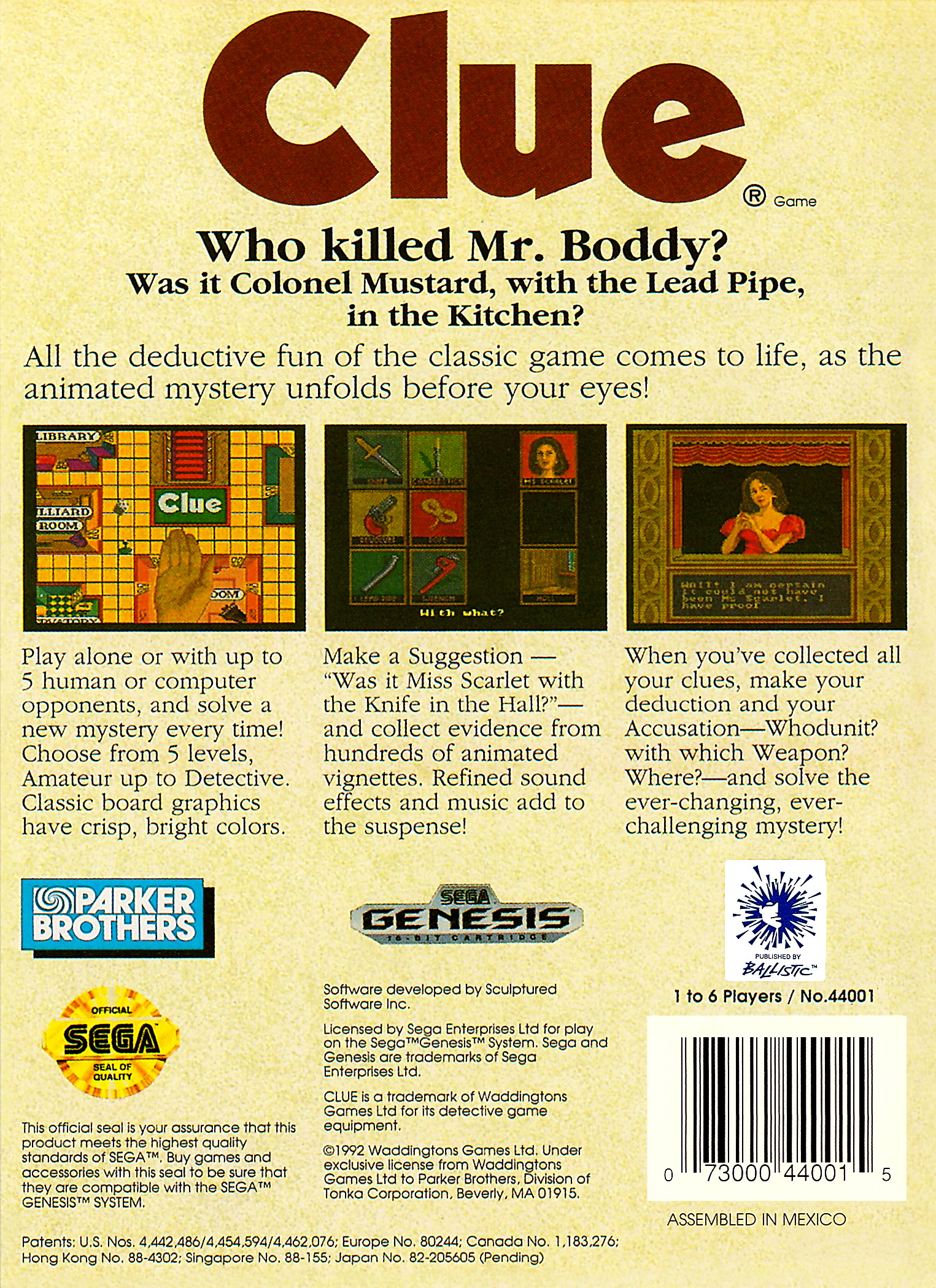 Based on the board game Clue. A murder has taken place in a mansion. You play as one of the 6 suspects in this case. You have to find out who committed the crime, and with what weapon and where in the mansion it took place in. There are 5 levels of difficulty which basically give you less information the harder up the level.
