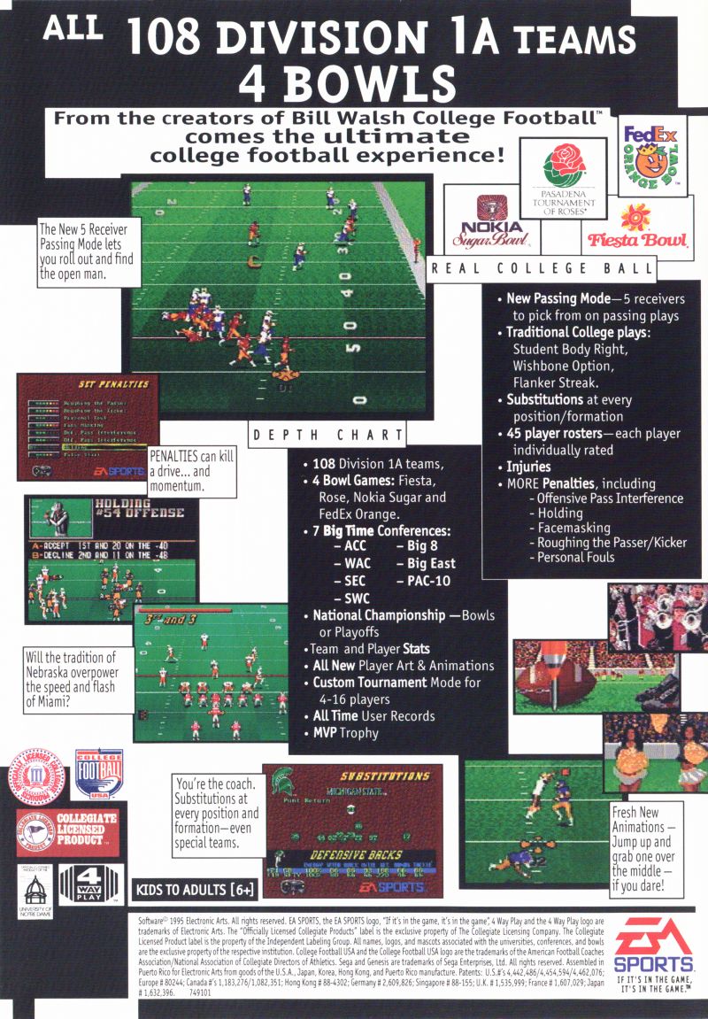 Released about the same time as Bill Walsh College Football 95, this American football game was unlicensed and did not feature any big names to it. It was considered a clone of NFL Football '94 Starring Joe Montana, just an updated version but now with college teams. It features 32 college powerhouses from four major divisions, letting you play exhibition games or letting you compete in a tournament to achieve an #1 ranking, as opposed to competing in a season to obtain it. It also has the option to play it on Team Player letting you control four players at once.