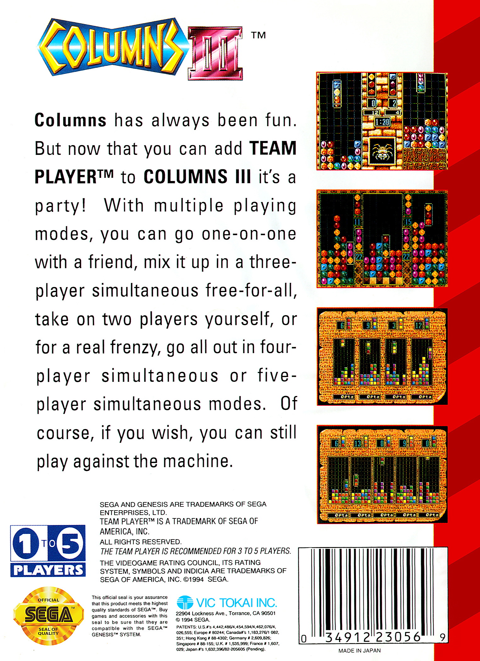 Third game in the Columns series. In this fast-paced puzzle mayhem, your goal is to arrange three or more jewels of the same colour horizontally, vertically or diagonally to remove them from the playing screen. While the jewels are falling, you can change the order of their colours. In the Arcade, Versus, and Time Trial modes, you can test your skills against an opponent, a clock, or a specific task such as removing a particular jewel. New features include a rising bar that can be used to annoy opponents and magical items that have strategic value to alter the outcome mid-game.