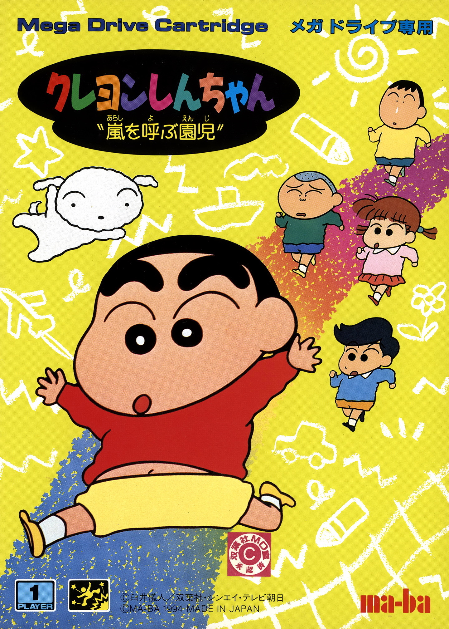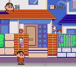 Arashi o Yobu Enji ("A Kindergartner Called Tempest") is one of many games based on the manga and anime created by Yoshito Usui. In four stages, each made up of five areas, Shin-chan must explore his neighborhood looking for a specific object. He can enter houses to ask people for information, but will often end up simply insulting them. He must also avoid or knock over the other children in the neighborhood, and has various ability cards that he can use to assist him, which might give him a water pistol or refill his health. After finding what he's looking for, Shin-chan will move on to the next area.