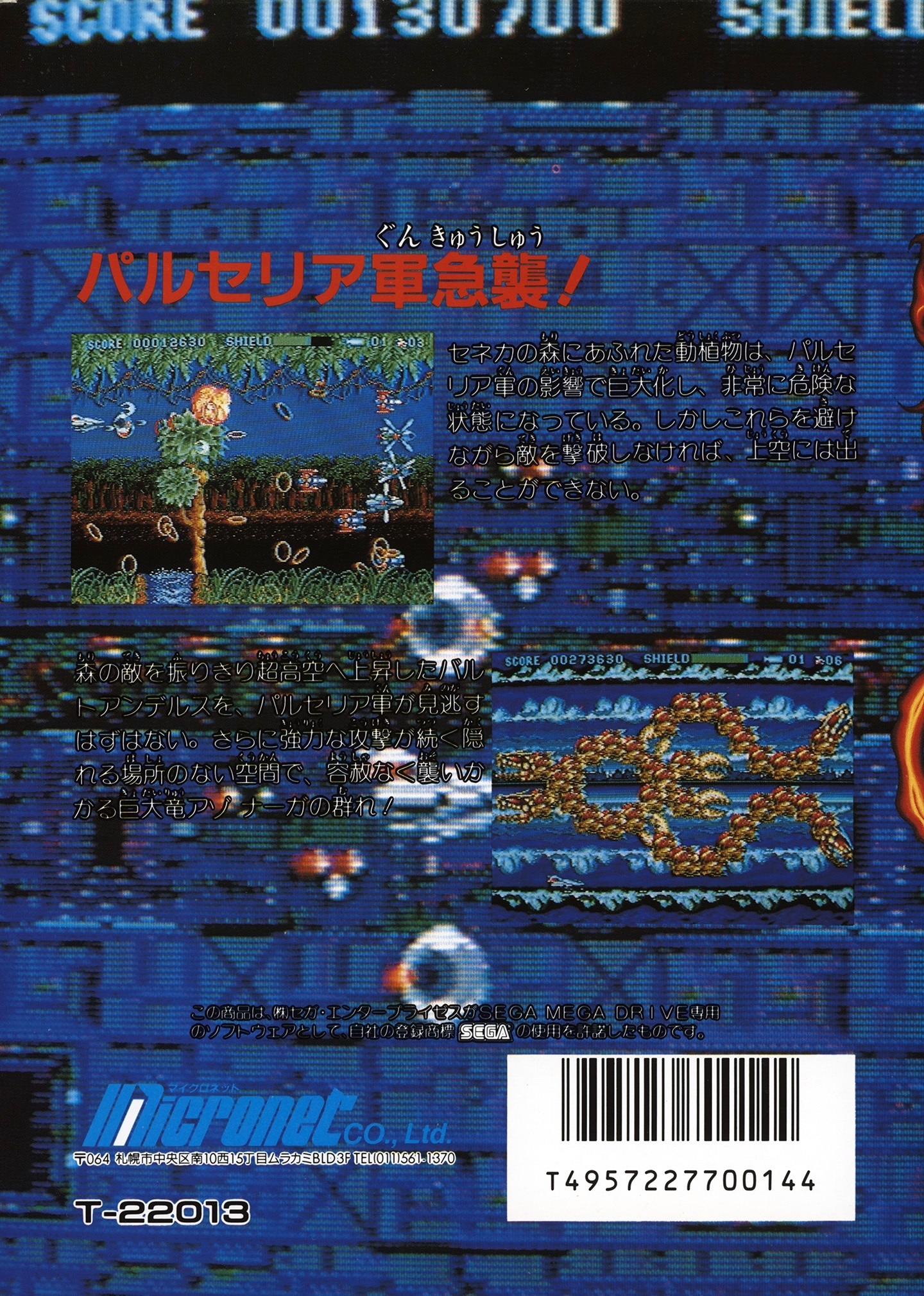 There a variety of weapon power-ups to collect, each with three power levels. There is a spread shot that can cover nearly the entire screen, a bomb that explodes into shrapnel when it connects, and a twisting wide shot that can pass through environmental obstacles. There are also homing missiles, smart bombs, speed-ups, and an option that can be placed on any side of the ship. The ship also has a shield which can absorb damage from smaller bullets, meaning it can take a few hits before exploding unless it's hit by an enemy ship, part of the landscape or some special enemy weapons that just ignore the shield.