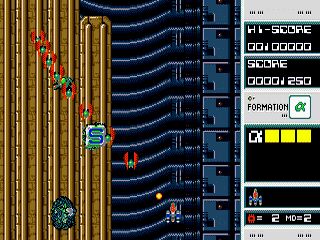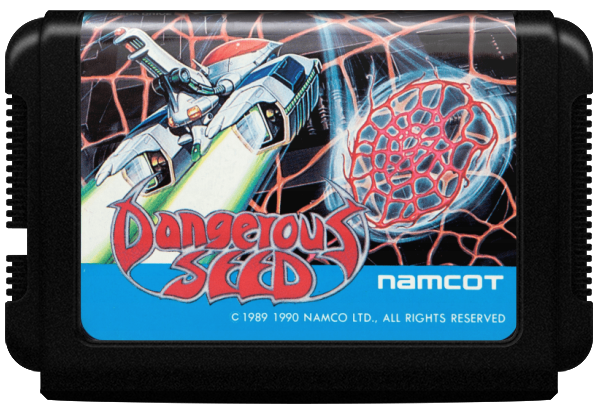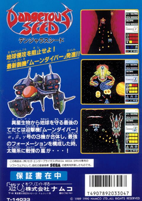 Dangerous Seed is a vertical scrolling shooter converted from the 1989 Namco coin-op. The player controls the three-part fighter ship Moon Diver through 12 stages to confront the alien menace and secure peace in the solar system. Each of the three parts of the ship, Alpha, Beta, and Gamma, have their own properties which can be combined in various ways. Each type and combination has multiple shot types which can be powered up, and there are also options and bombs available which contribute to Moon Diver's extensive arsenal.