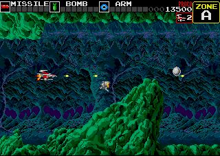 What sets Darius apart from other shoot'em-ups of the time is its way of letting the player choose his path with a certain amount of freedom. At the end of each area (level), you are able to choose between one of two worlds which the area branches into. This renders a higher replay value, since there are many paths to reach the end of the game by. Apart from this, the gameplay is on the simplistic side, both due to unimaginative attack waves and little interaction with the surroundings, but mainly due to the very basic powerup system, which is nowhere near the complexity of the aforementioned R-Type's and Gradius'.