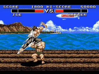 Unlike most other fighting games, you can control only one character (Joe) in single-player mode. In two-player mode, you can choose to fight as any of the seven available fighters, and also choose a scenery. The game plays like a standard 2D fighter: you can punch, kick, and jump on you opponents, but the fights are not entirely 2D, since you can also take a few steps vertically.