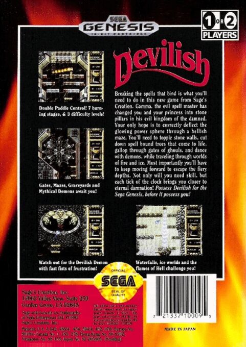 Devilish is different from other paddle games by letting you play with two paddles. The lower one behaves just like a usual paddle - you use it to prevent the ball from dropping down. The upper one can move and turn, allowing you to hit the ball from different angles and from different parts of the screen. You advance through levels by destroying bricks and enemies, going up until the level boss enemy appears.