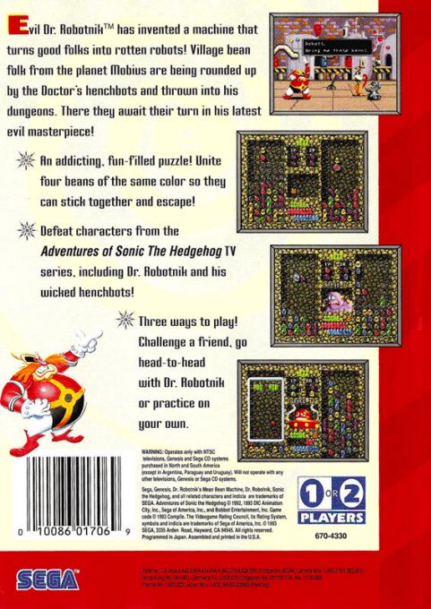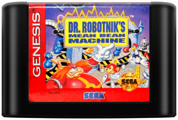 Dr. Robotnik's Mean Bean Machine is a version of Puyo Puyo with a storyline involving characters from the Sonic the Hedgehog games. The evil Dr. Robotnik decides to turn the citizens of Beanville into robots. It's up to the player to save them from their doom. The player drops pairs of beans into the dungeons, trying to create groups of four in matching colors. He or she must challenge Dr. Robotnik's robots to a battle and defeat them, and eventually face the Eggman himself.