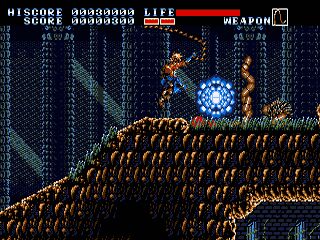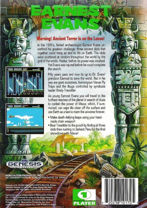 This is an action platform game in which you control Earnest Evans, armed with his trusty whip. The hero can jump, climb ropes, crouch, and crawl. There are plenty of obstacles on the levels (bottomless pits, spikes, crushing bridges, lava, etc.), as well as gangsters and monsters to dispose of.