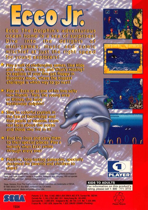 Ecco Jr. is a prequel to Ecco the Dolphin, set during his childhood. Together with his friends Tara the Whale and Kitney the Dolphin, Ecco goes looking for the legendary blue whale. Released after the two main Ecco games, this title is geared towards younger children with simplified gameplay, lacking the difficulty of the other Ecco games. The game also contains a number of educational facts about dolphins.