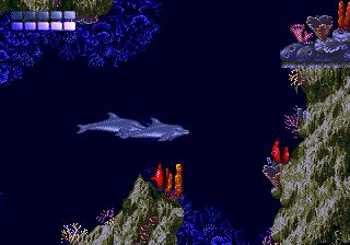 You must keep an eye on the life and breath meters. Dolphins can't stay underwater for a long period of time and must return to the surface for air. However, the cavern systems may hide the occasional pocket of air as well. Every time you are hit by spikes, lava, or an enemy, Ecco loses health, and once it reaches zero you will have to replay the level from the beginning. The life meter can be replenished by eating fish or by finding healing clams, called the Shelled Ones, and communicating with them. It's possible to avoid most enemies, but Ecco can kill troublesome creatures using the death sonar or by charging them head-on.
