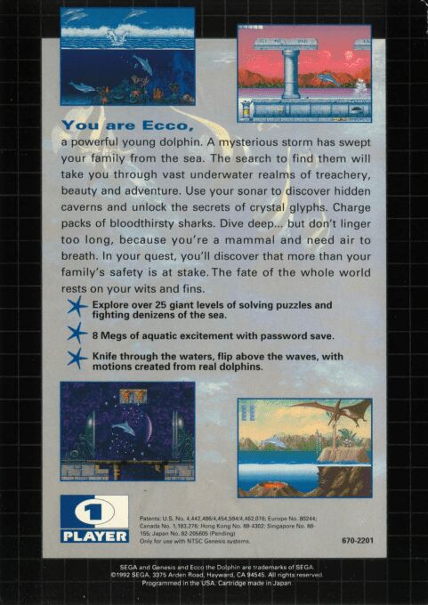 The storyline is actually deeper that one may think by looking at the box illustration. As Ecco, you are the only dolphin who managed to escape from a giant whirlpool which sucked down your entire pod. The five shining stars on your forehead show that you are the chosen one to save them. But that task will be not be an easy one, as you will have to travel through time and space with the Atlantean time machine, and meet the mystical Asterite in order to defeat the Vortex Queen.