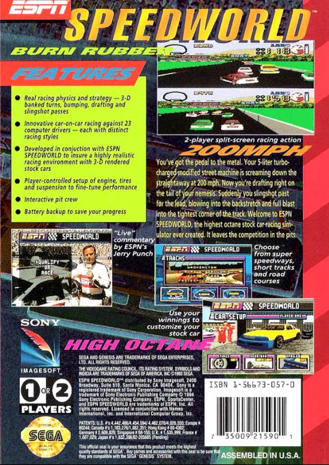 ESPN Speed World is a generic racing game that is made to resemble NASCAR. The player is given a stock car and can tune the car from the angle of the spoiler, to the setting of the shocks, and up to the pressure of the tires.