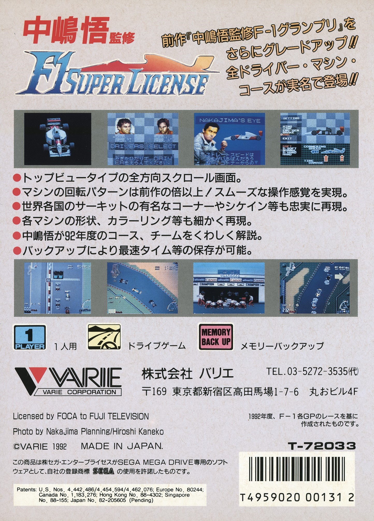 F1 Super License is the third and final Satoru Nakajima F1 game for the Mega Drive. Eschewing the cockpit view of F-1 Hero MD, this release returns to the top-down view of the earlier F1 Grand Prix. It features an official FOCA license and represents the 1992 season.