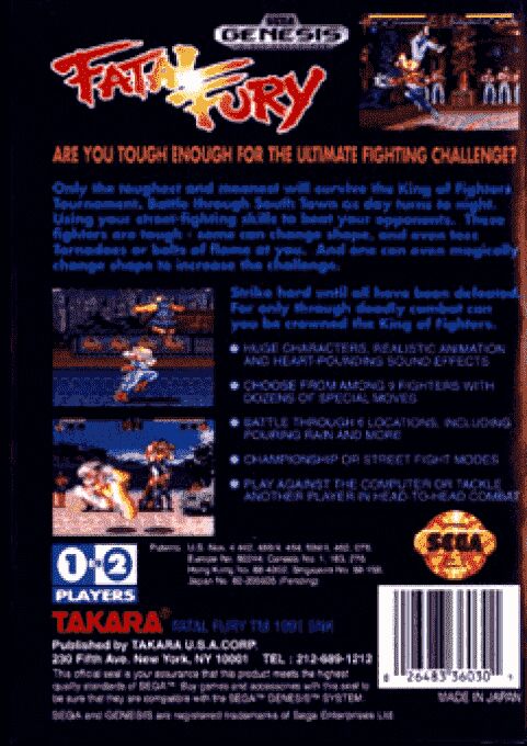Fatal Fury is a 2D fighter and is the first game in a series of one-on-one fighting games by SNK. It's a conversion of the original Fatal Fury arcade game. This first game does not yet feature the series' trademark pseudo 3D mode (which allows you to move between the foreground & background while fighting). Includes a two-player vs. mode.