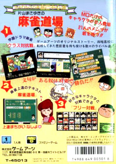 Gambler Jiko Chūshinha: Katayama Masayuki no Mahjong Dōjō is a traditional 4-player mahjong game based on the manga by Masayuki Katayama, one of many produced by Game Arts over the years. The game offers both a free play mode and a lighthearted story mode which follows Katayama's characters, a group of students who play mahjong to settle their differences. There is also a "Mahjong Dojo" mode which quizzes you on aspects of the game in order to help you learn how to play better.
