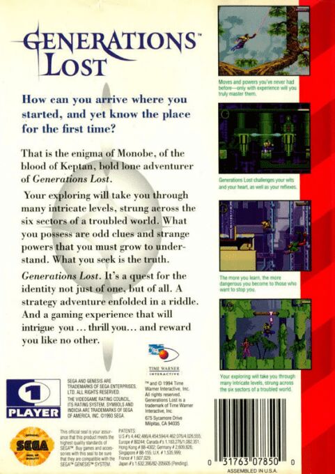 Generations Lost is a platform action game in which the player takes the role of Monobe, an adventurer on the search for the past of his people. Thanks to his magic armour Monobe is able to execute many different moves. Besides running and jumping, Monobe can roll on the ground, deliver blows with hands and feet, and shoot energy balls. With the help of an energy rope Monobe can swing from platform to platform.