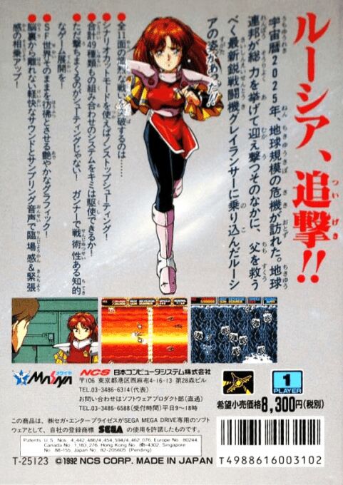 The Gleylancer comes equipped with two hovering satellites that can receive weapon upgrades of their own, and can lock their positions at specific angles to increase your firepower and protect the player from enemy attacks. Features only a single-player campaign with two different endings depending on how the final stages are completed (e.g. if Lucia's father is rescued or not).