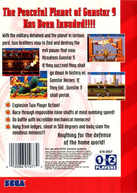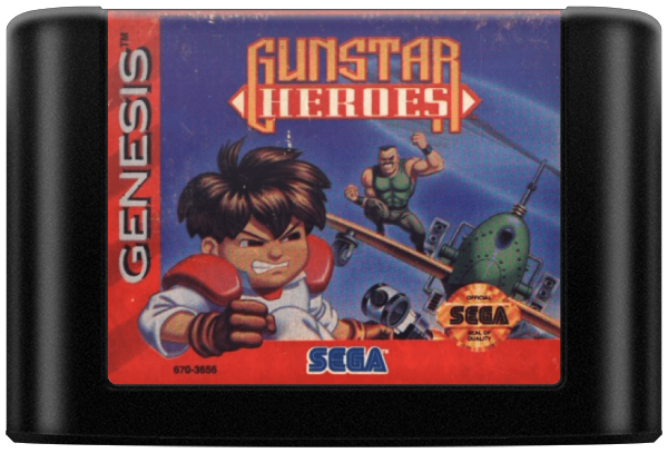Gunstar Heroes is a fast-paced side-scrolling shooter. Controlling either Red or Blue Gunstar, the player has access to four basic weapons: Force, rapid shot; Lightning, a straight shot that penetrates enemies; Chaser, a homing weapon; and Flame, a powerful close-ranged. The player can combine two weapons to produce a new one, for a total of fourteen weapons. It is also possible to use melee attacks and moves such as grabbing and tossing enemies, jumping, and sliding.