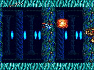 Destroyed enemies may leave behind items which have beneficial effects when collected: increased speed, better weapon power, a shield, extra lives or transformation into a robot. The robot has a more powerful weapons system (laser beam and homing energy balls instead of a vulcan gun), but also a downside: its large size makes it easier to be hit by enemies or crash into the environment. If that happens, a life and all collected upgrades are lost and the ship is reset at the last checkpoint.