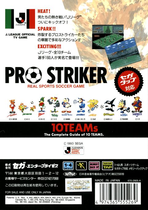 Pro Striker is the first title in Sega's early-'90s soccer franchise. It is an arcade-style soccer game similar in play to Sega's earlier World Championship Soccer. The game is viewed from a birds-eye perspective with a full field minimap on the side of the screen. The player can also make substitutions and choose from six different formations. It features an official J.Leauge license, including all ten teams and all players from the 1993 season. There is an exhibition mode, a playoff mode, and a full league mode, and up to four players can play simultaneously.
