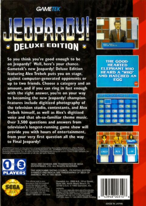Jeopardy! Deluxe Edition is an updated version of it's Jeopardy! predecessor which features over 3,500 different new questions along with the standard features of Jeopardy such as Daily Doubles, a digitized likeness of the host, Alex Trebek and even the theme music.