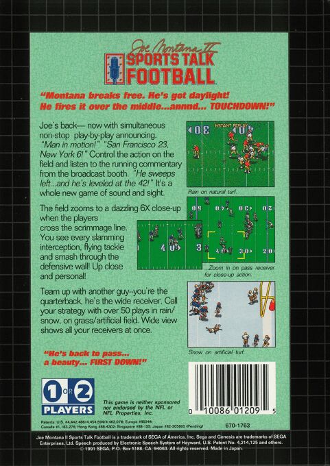 Sports Talk Football is Sega's second football game on the Genesis, again licensed from San Francisco 49ers quarterback Joe Montana.