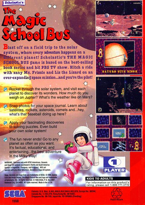Based on the PBS kids program, The Magic School Bus along with Ms. Frizzle and her companion Liz takes the player throughout the solar system one planet at a time to learn about them while exploring each one. Along the way, players will be transported on the bus on their way to the next planet where they can take photos of the planets, their moons, stars, among many other things they can see. Along the way they will encounter puzzles they have to solve in order to advance using the facts they have learned through their planetary visit and can also build their own solar system in any way they choose.