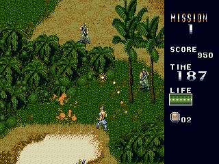 Finding strategic placings is important, especially as you can't shoot while on water. Most of the time you are on foot, but at times you can hijack vehicles of shot foes. There are improved weapons, smart bombs and energy recharges to collect. Each of the 8 levels ends with a large vehicle requiring multiple shots to destroy.