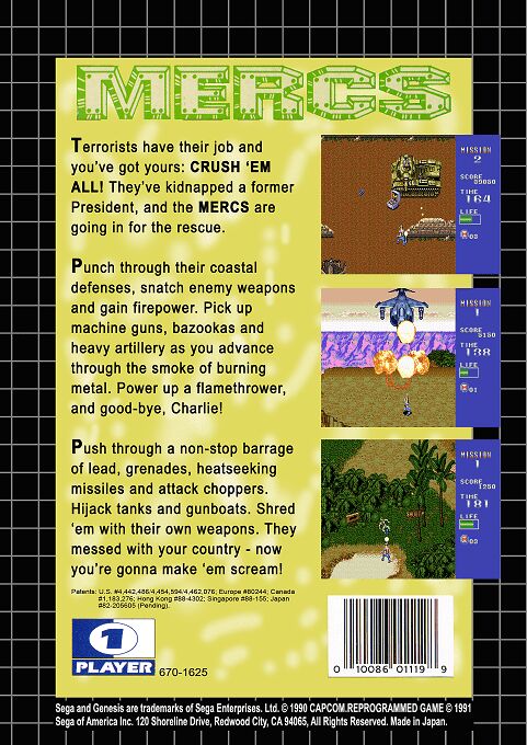 Mercs is a shoot 'em up influenced by Ikari Warriors. You are an anti-terrorism soldier, and must rescue a former President from a Central African revolutionary gang.