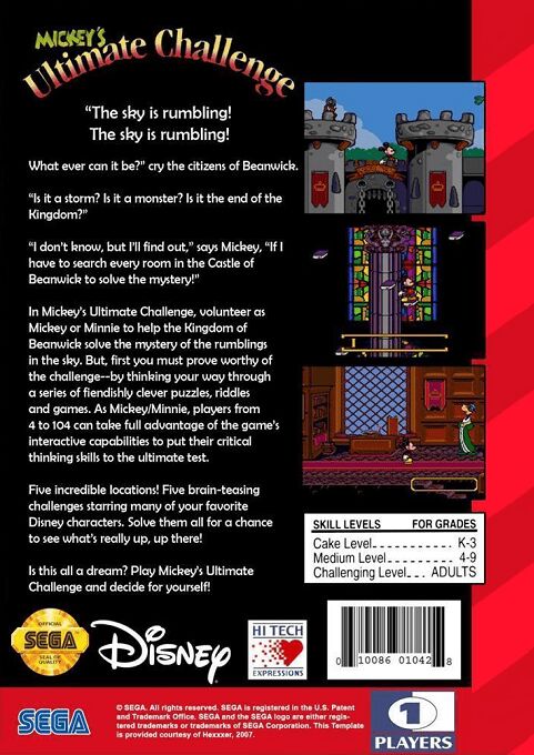 Mickey's Ultimate Challenge is a puzzle game in which the player chooses either Mickey or Minnie to play with. They'll find five characters from the Disney's universe in the kingdom, and will be prompted to help them in several tasks.