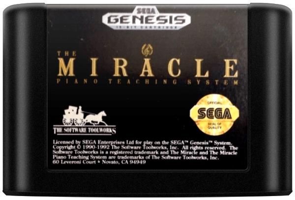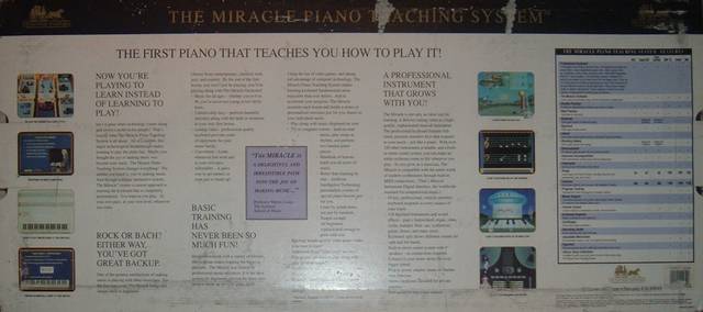 The Miracle Piano Teaching System teaches piano to beginning / intermediate players using a combination of scripted lessons, dynamically created lessons, and piano-themed video games. The original version came bundled with a custom piano keyboard. Later versions work with any MIDI keyboard.