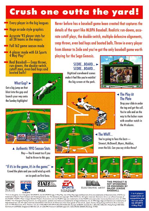 The strategy of baseball is merged with a fast-paced arcade game in MLBPA Baseball from Electronic Arts. Details designed to appeal to the die-hard fan include: real players with statistics based on the 1993 season; a full 162 game season mode; stadium music; animated scoreboards; defensive alignments; cut-off plays; run-downs; and even the double switch. Features meant to appeal to the casual fan include: large colorful arcade graphics; one stadium with animated crowds; a simplified pitching interface allowing players to steer the ball; and a batting interface that relies on timing instead of aiming cursors. Secret power-up play modes await so step up to the plate and take some hacks! Season play can be continued using passwords provided at the end of each game.