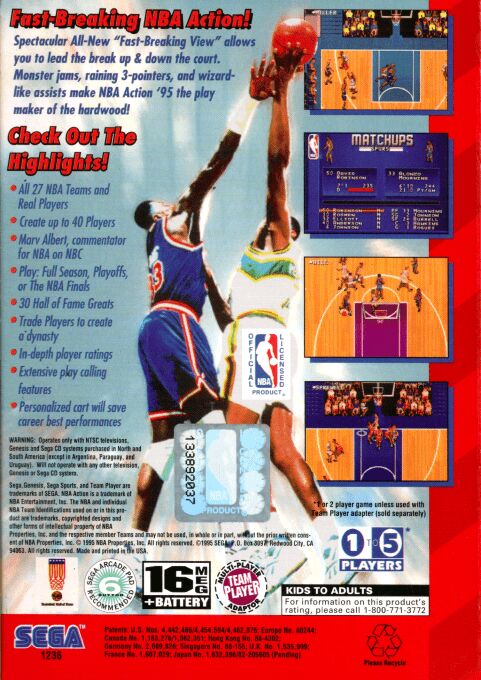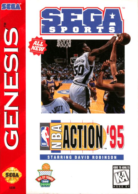 This is the sequel to NBA Action '94 with the standard modes (Exhibition, Season, etc.) and features 300 top players of the 1994 NBA season and all 27 NBA teams and their respective logos. Players can also edit their own team's roster and create up to 40 different custom players that can be saved to the game's battery back-up. The game not only has former San Antonio Spurs player, David Robinson, endorsing and appearing in the game, but also play-by-play commentator Marv Albert also lends his voice talent to the game.