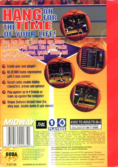 NBA Hangtime is a 2-on-2 arcade basketball action game following in the footsteps of NBA Jam. All NBA teams, each featuring 4 players to choose from, are included along with fast paced, over-the-top basketball, disregarding the normal rules of the game but including fouls and out of bounds. You can also create your own player, with a collection of body parts and clothing to choose from.