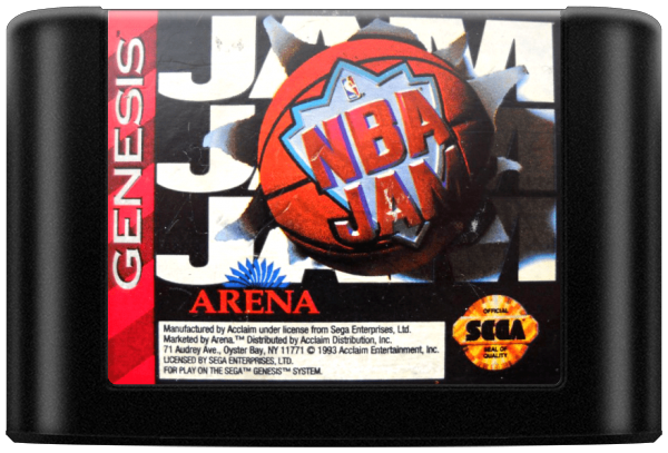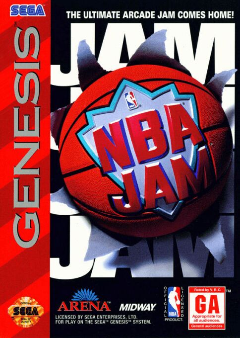 NBA Jam is a two-on-two basketball game You can play any NBA team, and you can play as players like Barkley, Starks, Pippen, and Grant. Each human player controls a single player, so choose your squad wisely to take team-mate skill into account. The game is action-oriented, and players can perform unrealistic slam-dunks. Full performance statistics are automatically recorded. The play clock and 3-point line apply, but other rules are largely overlooked.