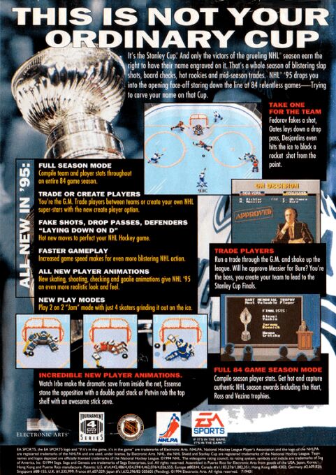 NHL 95 was EA Sports' third licensed ice hockey game, promising the fastest action in the series to date. The action is viewed top-down, and can be played with or without realistic penalties. There is a full season mode, allowing you to guide a team through all 84 matches, with the option of injuries potentially putting players out of a sequence of matches. You have full control over trading and creating players for your squad. New in-game moves include dummy shots and lie-down blocks.