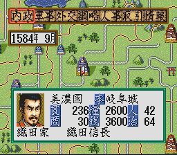 Haōden is the fifth game in Koei's Nobunaga's Ambition series, and once more is a historic war simulation set in 16th century Japan. Up to eight players can participate in one of three different scenarios with the ultimate goal of unifying the whole of Japan. Nearly 60 different real-life warlords and their territories are represented and available to play as. The three scenarios available are Nobunaga's rise to prominence in 1551, the Tenka Fubu campaign towards Kyoto in 1568, and Nobunaga's death in 1582.