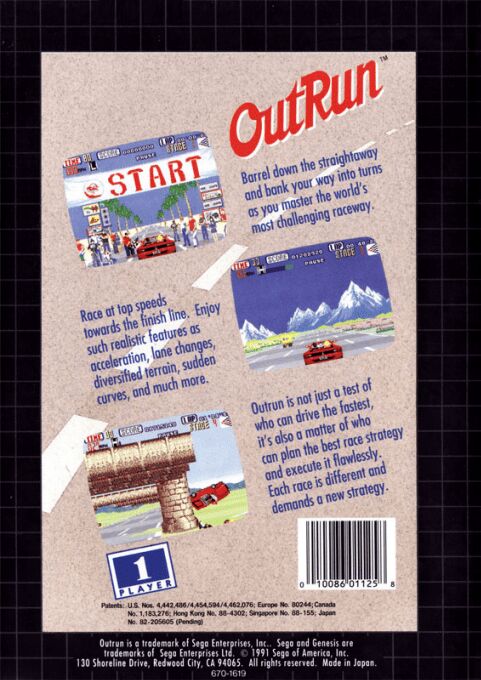 OutRun is a racing game that allows the player to race across varied terrain in a readily available Ferrari, complete with a female passenger, over a series of short tracks.