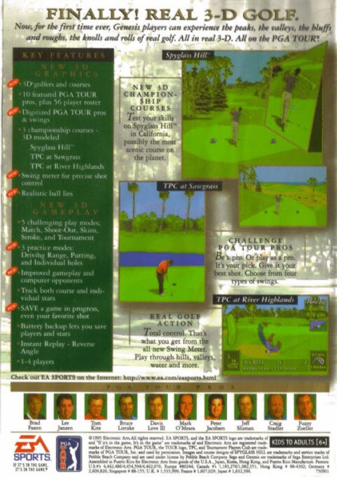 PGA Tour 96 was the last of the series released for Sega's 16-bit console, and technologically the most advanced one. Instead of offering several generic courses, the three available (Spyglass Hill, Sawgrass and River Highlands) are in 3D, with height differences visible (as well as the limited 3D abilities of the console allow).