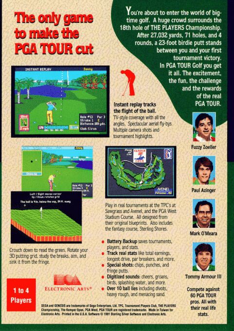 PGA Tour Golf introduced many of the conventions commonly seen in the genre since. The three-click control method (the first to start the swing, the second setting power and over-swing, the third setting draw or fade) allowed for a multitude of different shots, and required a sense of timing.