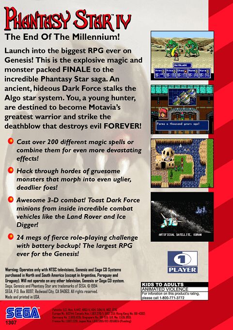 Phantasy Star IV is a Japanese-style role-playing game with top-down world map exploration, random enemy encounters, and turn-based combat. The gameplay of the fourth entry in the series is similar to that of the second installment, sharing notable features such as the ability to equip two weapons at once, most of the "techniques" (equivalent to magic spells in comparable games), etc. The dungeons are noticeably less maze-like than in Phantasy Star II. Player-controlled party may include up to five active combatants.